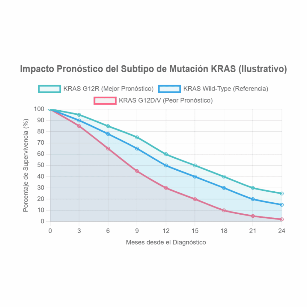 - KRAS G12R: Se asoció con un mejor pronóstico, con una supervivencia general promedio de 13.2 meses.