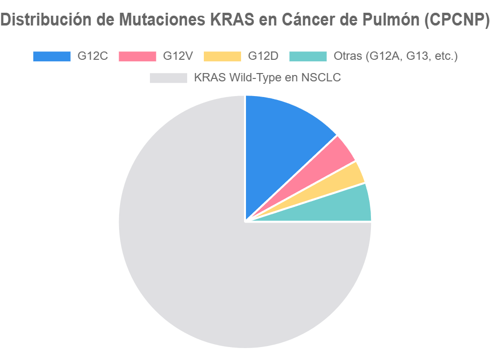 Gráfico 1: Distribución aproximada de los subtipos de mutación KRAS más comunes en Cáncer de Pulmón de Células no Pequeñas (CPCNP). La mutación G12C representa la porción más grande, abriendo una ventana terapéutica específica. Datos adaptados de Let’s Win PC y PMC7817862.