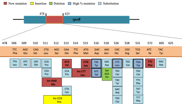 • Se dirige a las mutaciones más comunes que confieren resistencia a Rifampicina en el gen rpoB de M. tuberculosis evaluados con un gen sintético con las mutaciones de la región RRDR del gen rpoB de M. Tuberculosis.